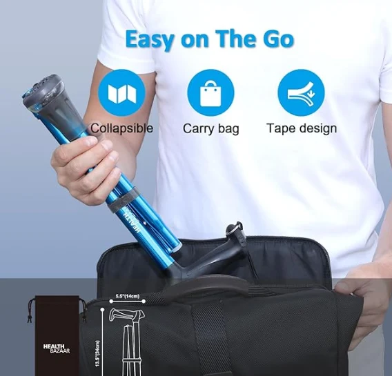 نوار راه رفتن تلسکوپی تاشو. Premium نوار روی شافت نیشکر و یک کیسه حمل به صورت استاندارد آمده است که می تواند برای اتصال عصا و حمل آن به راحتی استفاده شود. همه طرح های متفکرانه باعث می شود که حمل و ذخیره دیگر سردرد نباشد. سیستم پایه کل ایمنی در تحرک روزانه را به حداکثر می رساند.