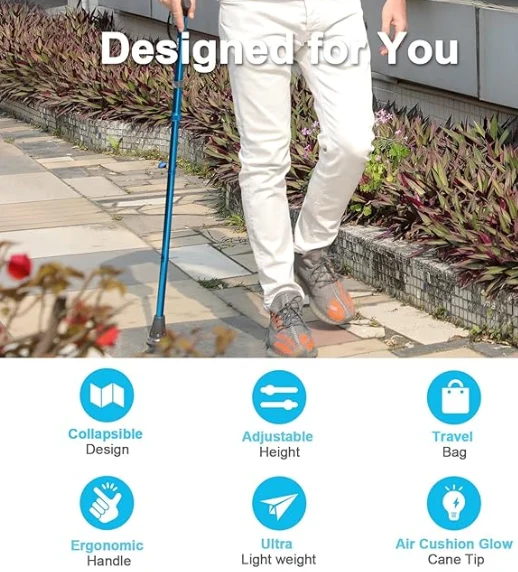 عصا راه رفتن تلسکوپی تاشو ، نوک خود را در شب چراغ می کند ، که ایمنی پیاده روی در شب را تا حد زیادی تضمین می کند. (با قرار گرفتن در معرض نور فقط برای مدت معینی ، مخروط درخشش در تاریکی مشاهده می شود.